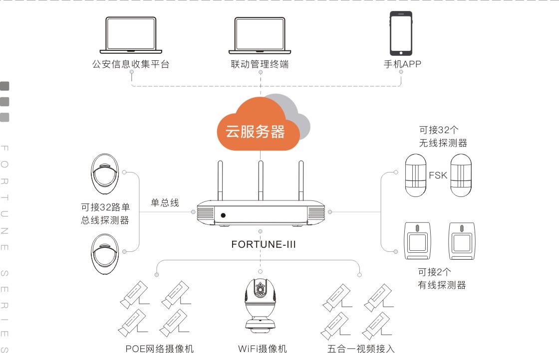 秉承智慧之芯,兼具內外之美!專為門店、小倉庫、小辦公室、家庭傾心打造 ,F(xiàn)ORTUNE-III,可接入高清9路IP攝像機,64路無線個性化探測器傳感器接入,本地存儲+云存儲,提供預覽/錄像/回放等功能;支持視頻報警聯(lián)動,支持遠程家電控制,支持手機監(jiān)控,支持美安云3.0服務,實現(xiàn)APP秒連預覽。